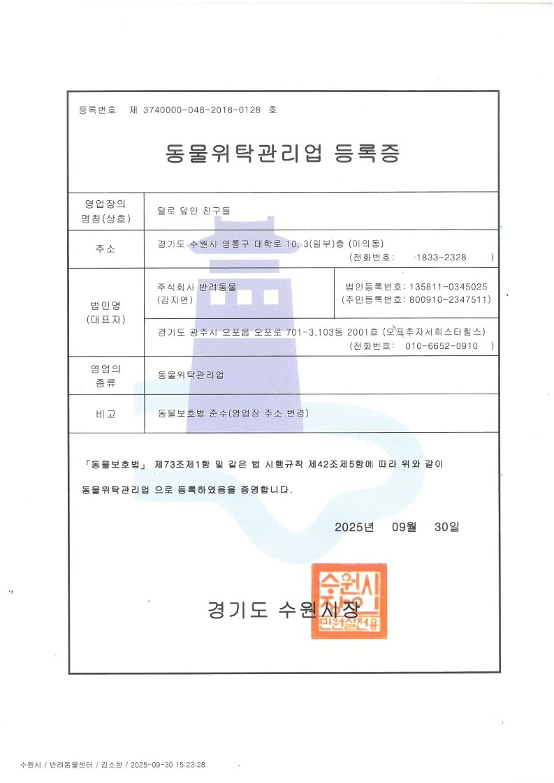 공지사항 털로덮인친구들 수원광교점 영업등록증 페이지 정보 작성자 털로덮인친구들 댓글 0건 조회 99회 작성일 25-11-07 15:17 본문 털로덮인친구들 수원광교점 영업등록증 검색 목록 다음글2025 추석 연휴 호텔링 서비스 안내 [수원 / 영통 / 용인 애견유치원 털로덮인친구들 광교 본점] 25.09.22 댓글목록 댓글목록 등록된 댓글이 없습니다.